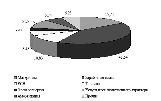 По результатам табл.1.3 можно сделать вывод о том, что основную долю затрат занимает заработная плата (41,64%) и материалы (15,74%), то есть производство является трудоемким и материалоемким.