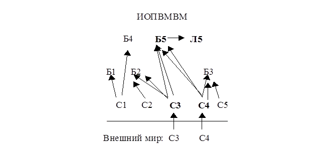 Врач узнает симптомы, признаки болезни С3 и С4, а дальше все происходит автоматически. Воспринятые из внешнего мира признаки активируют уже имеющиеся в памяти их прототипы С3 и С4. В памяти, в подсознательной модели мира эти признаки связаны с болезнями Б2, Б3 и Б5. Но только болезнь Б5 связана с обоими этими признаками и поэтому она и осознается как диагноз. Ну, а далее тоже все просто – для каждой болезни в современной стандартной медицине разработаны схемы лечения, и врач автоматически назначает лечение. В этой схеме не показано, что врач имел цель – найти способ лечения больного. Поэтому более полная схема генерации идей приведена на рис.2.