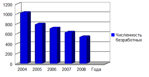 Численность безработных за период с 2004 по 2008 год снизилась практически в два раза (1024 до 538 человек), что говорит о снижении неудовлетворённости спроса на труд (Рис.2.14, Приложение Таблица 8). В Челябинской области численность безработных упала примерно на четверть (на 10686 человек).