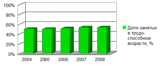 Доля занятых в трудуспособном возрасте в экономике МО также является важным показателем. В Челябинской области в целом ситуация стабильна - 55%, а в городе Усть-Катаве эта доля возрастает с 2004 по 2008 год с 50% до 53% (Рис.2.15).