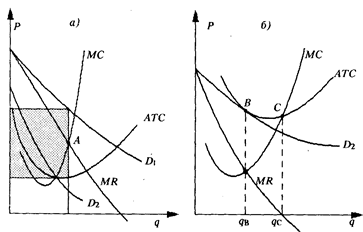 И еще одно интересное замечание: если рассмотреть рис. 1,б, то можно видеть, что, добившись равновесия в точке В (в долгосрочном периоде), фирма, действуй она в условиях совершенной конкуренции, обязательно увеличила бы выпуск продукции до уровня q с , поскольку в точке С она имеет минимальные средние суммарные издержки (т. е. в точке С она бы получила максимальную прибыль). Значит, в условиях монополистической конкуренции производится более широкий ассортимент товаров, но с более высокими издержками на единицу товара, чем при совершенной конкуренции.