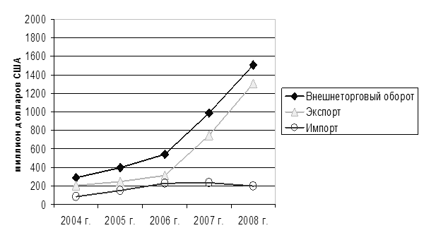За период с 2004 года по 2008 год наблюдается положительная динамика внешнеторгового оборота, так в с равнении с 2004 годом увеличение произошло в 5,19 раз.