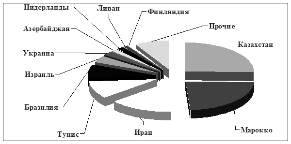 Внешнеторговые операции были проведены участниками ВТД Астраханской области с партнерами из 68 стран. Наибольший удельный вес при формировании ВТО имели страны, представленные на рисунке 3.