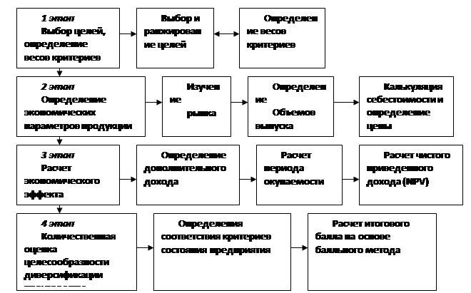Программа экономического обоснования диверсификации производства должна определять соответствие целей диверсификации общей стратегии развития предприятия, учитывать емкость рынка новой продукции, полученной в результате диверсификации производства, определять величину дополнительного дохода, полученного в результате реализации новой продукции. С учетом этих и других характерных задач в процессе исследования была разработана программа экономического обоснования диверсификации производства на машиностроительных предприятиях, состоящая из четырех этапов (см.рисунок).