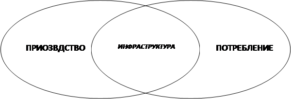 Экономические границы среды поддержки производственной инфраструктуры в функциональном аспекте не охватывают процессы реального хозяйствования в ходе расширенного производства, в этом по мнению А.И. Кузнецовой, проявляется основной порок и схематизм концепции инфраструктурного обеспечения. В реальной схеме воспроизводства нет границ между его фазами, подвижность границ обусловлена динамичным развитием и качественными сдвигами в общественном производстве. Они характеризуются усложнением многообразных взаимосвязей всех сфер деятельности, усилением процессов взаимодействия, взаимопроникновения и интеграцией производства и инфраструктуры (см. рис. 3.1.2).